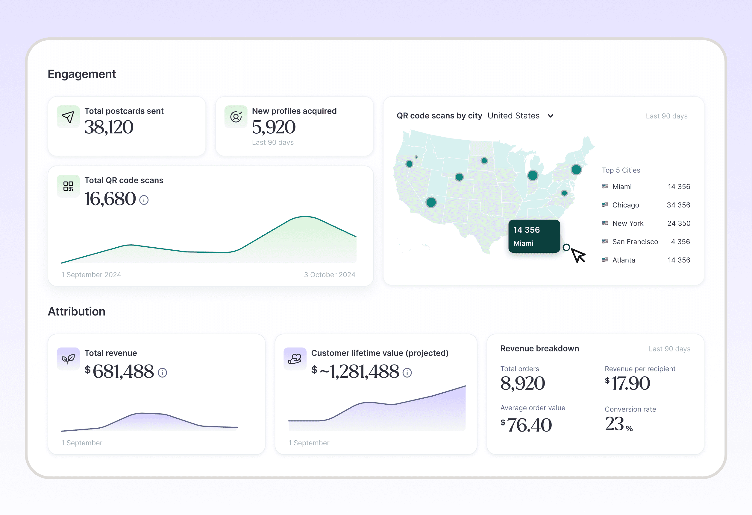 Every personalized postcard includes a unique QR code or PURL, powered by our SnapCapture™ technology. The moment someone interacts, you’ll see their engagement appear in your dashboard in real time — including time of scan, device type, location, and more.