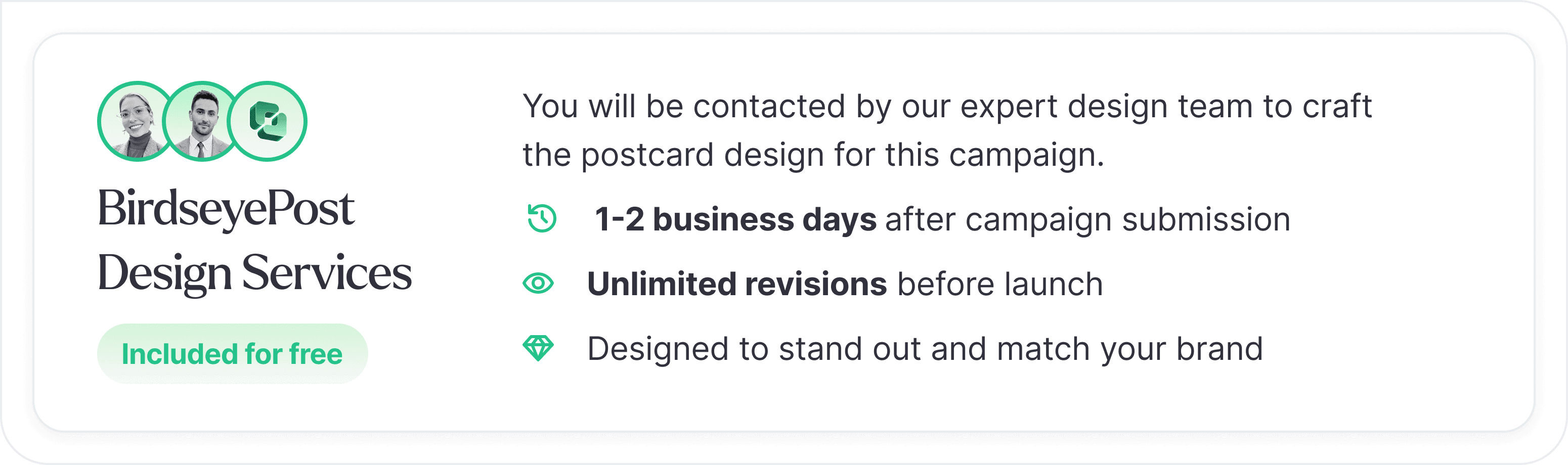 You can either upload your own mailer design or use BirdseyePost's professional design services—both are supported for every campaign.